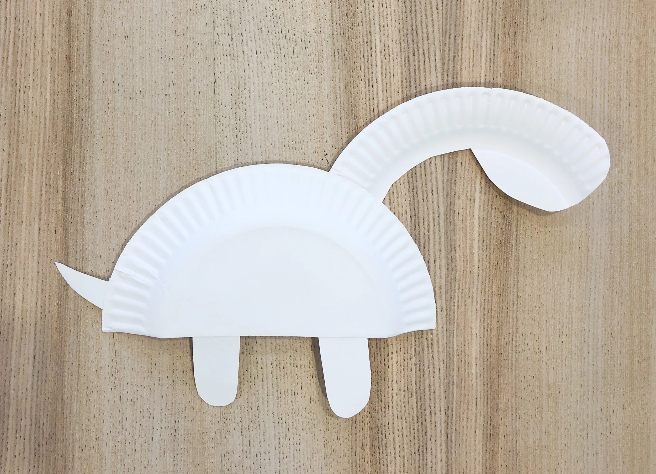 *Use the left over paper plate half (from cutting out the neck and head portion) to cut out two legs and a tail. Tape or Glue the pieces behind “the body.”